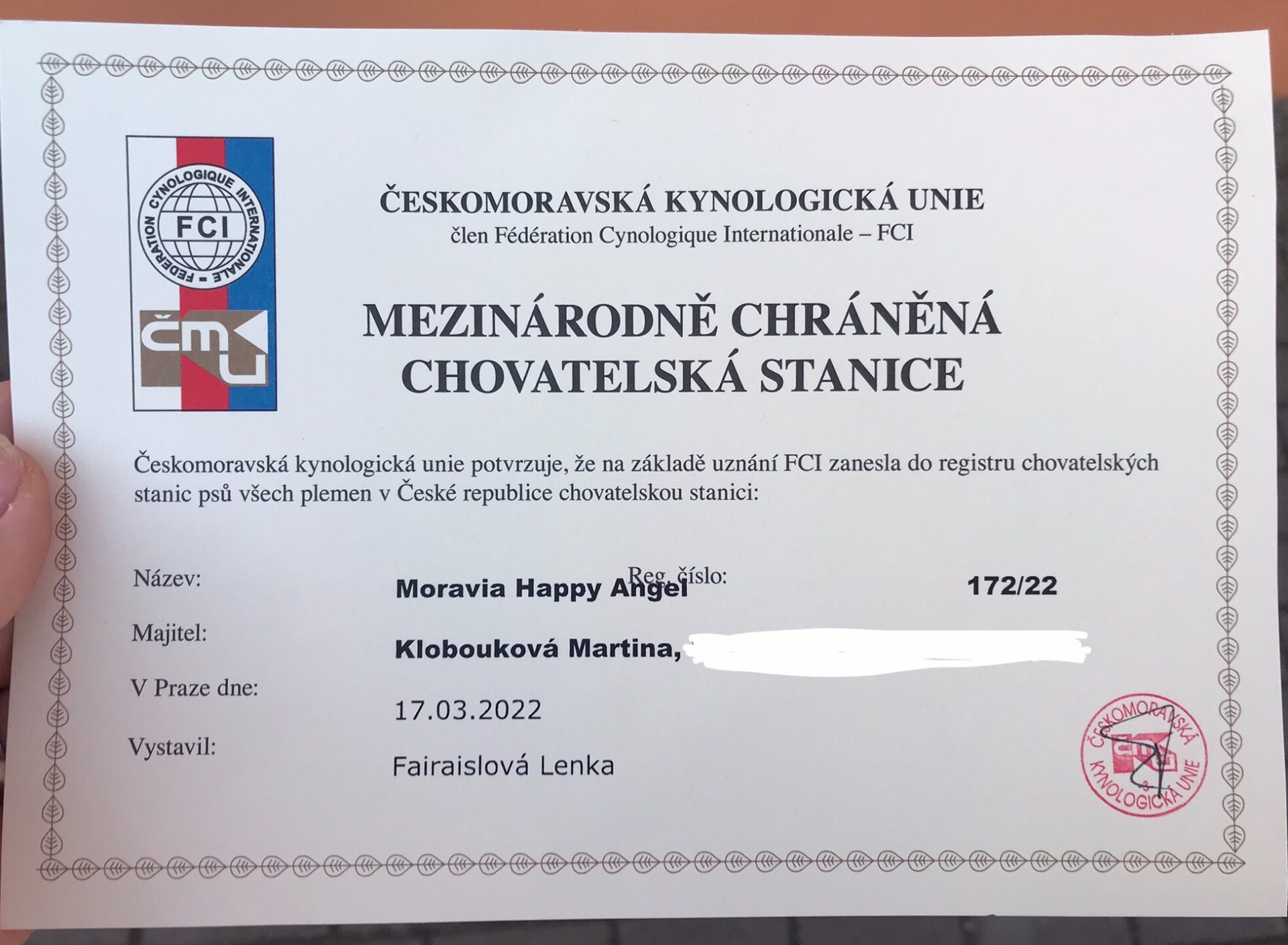 V březnu 2022 nám byl schválen název mezinárodní chovatelské stanice pod FCI “Moravia Happy Angel”. “Moravia” - protože žijeme na Moravě a jsme hrdí na své rodiště, a “Happy Angel” protože moje fenka je pro mě takový stále šťastný andílek, neustále se usmívá a nabíjí mne svojí energií.